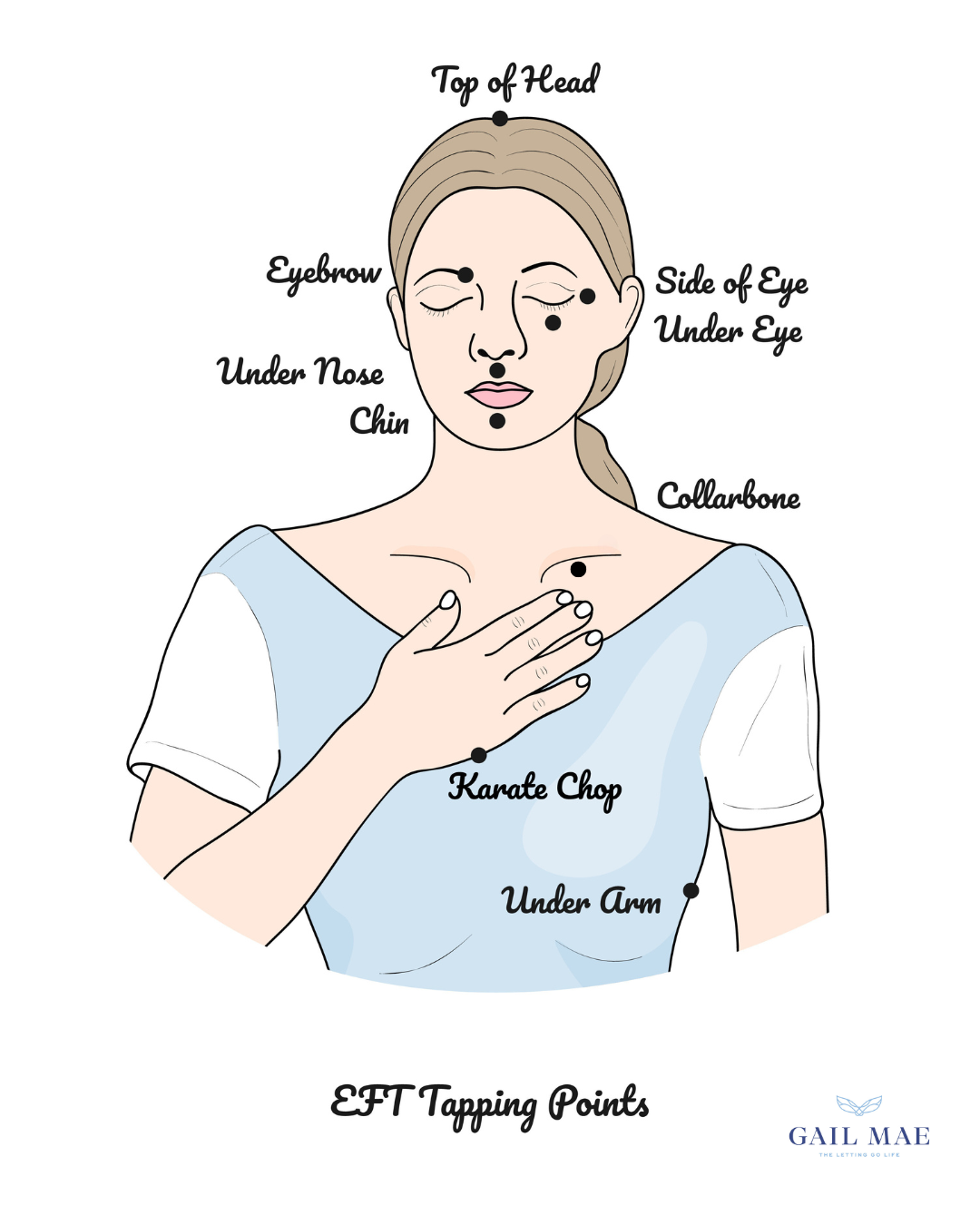 - Proceed around the body in a clockwise direction. Start at the Karate Chop Point → top of the head → eyebrow point → side of eye → under eye → under nose → under lip → collar bone → under arm and back to the karate chop point. Go around about 7-10 rounds, take a deep breath, and notice if the intensity of your feelings or belief lowered.